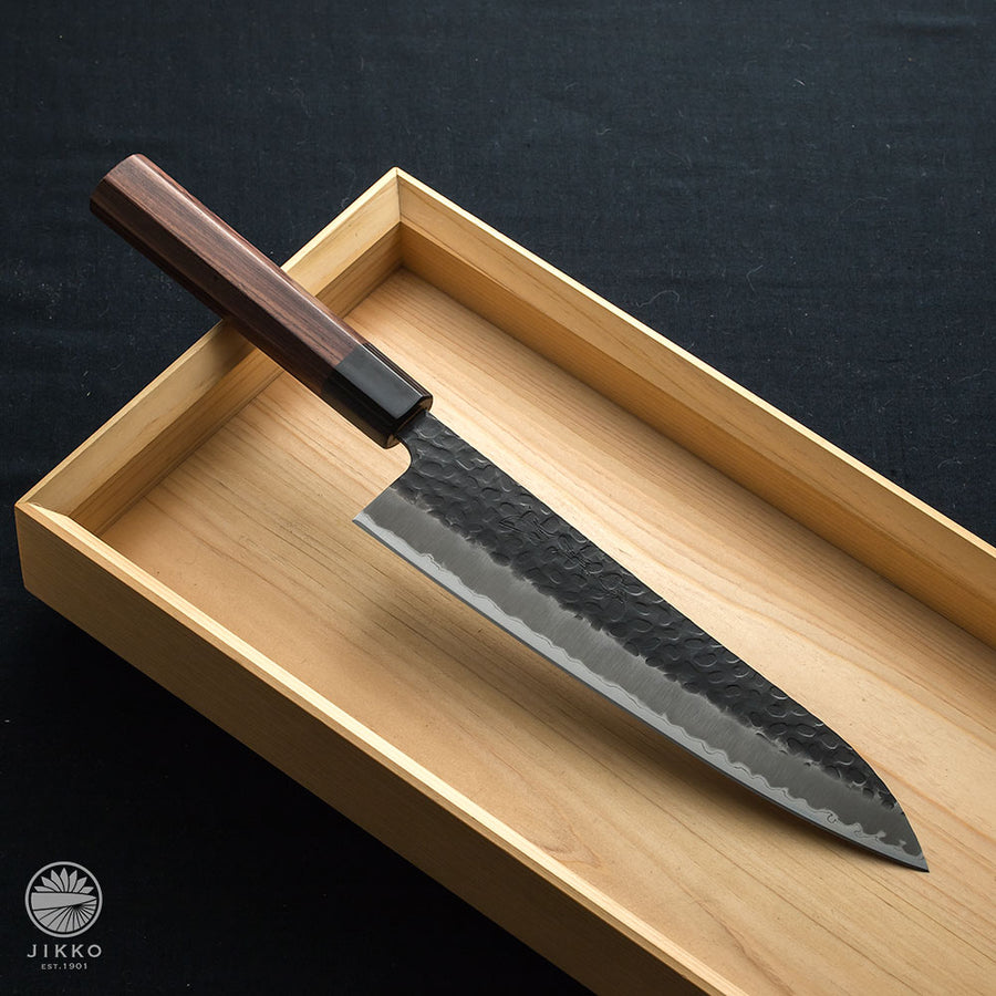 The Crator is a Japanese Gyuto made from Super Blue Steel, known for its exceptional hardness and edge retention. Its heavy, precise cuts and straight-edge profile allow for highly accurate performance. The striking kuro-uchi blade finish and deep-toned wooden handle create an atmosphere of focused craftsmanship—perfect for chefs aiming for the next level.